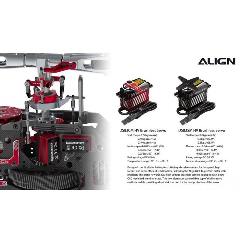 The new CNC machined aluminum cased DS830M brushless high voltage cyclic servos paired with DS835M rudder servo not only exhibited top of the line servo aesthetics, but also combine heat sink function and best performance in the market segment.