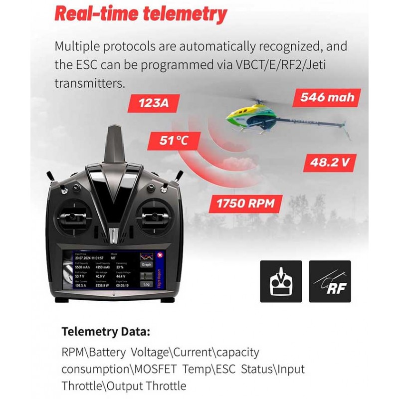 Telemetry capability: VBCT/E / RF2 / Futaba SBus2 / Jeti / MSH Brain / iKon