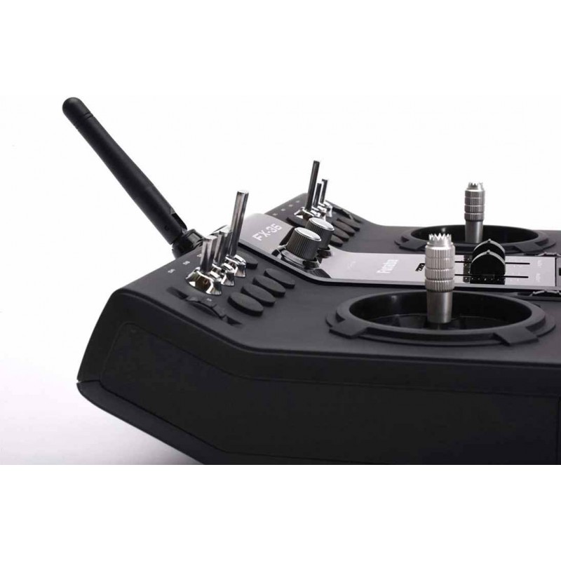 L'émetteur FX-36 est doté de manches de précision avec crantage et recentrage automatique, de 6 interrupteurs à bascule, 2 interrupteurs à glissière, 6 potentiomètres numériques et 2 potentiomètres proportionnels. Il offre la possibilité d'installer des interrupteurs supplémentaires à levier ou sur les manches.