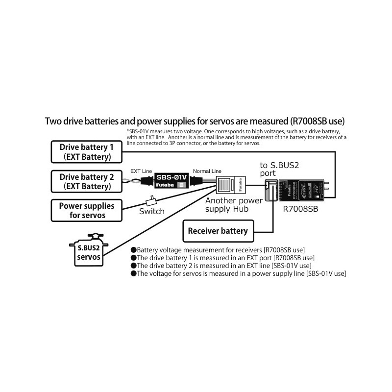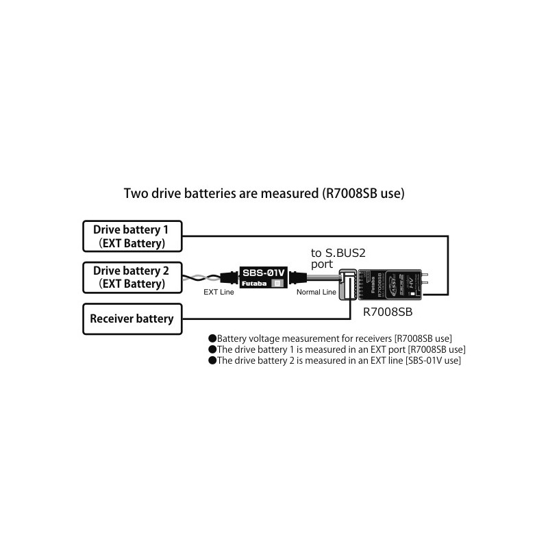 Cette sonde télémétrique S-Bus2 permet de mesurer la tension de la batterie du récepteur et la tension d'une seconde batterie ou d'une alimentation.